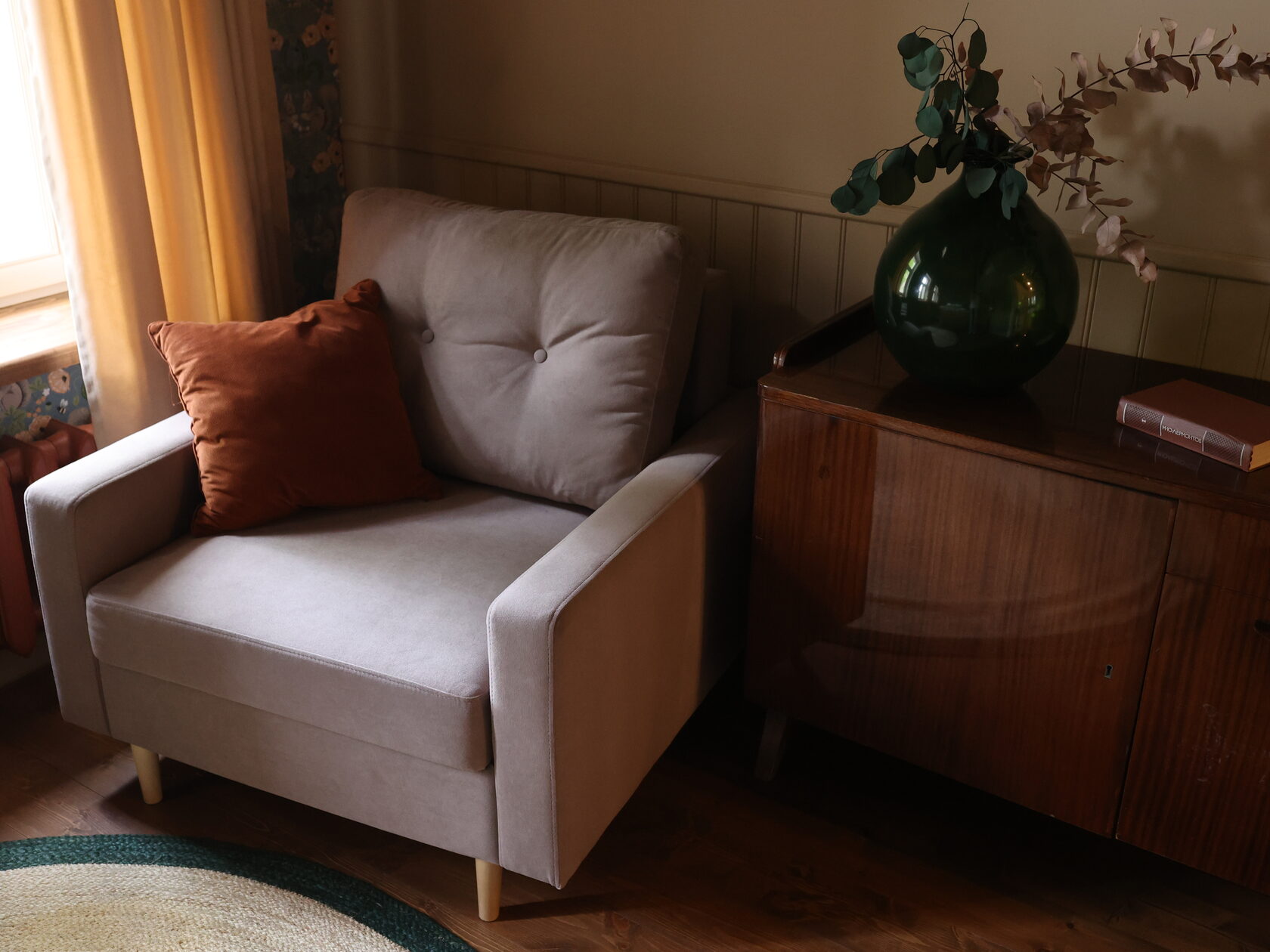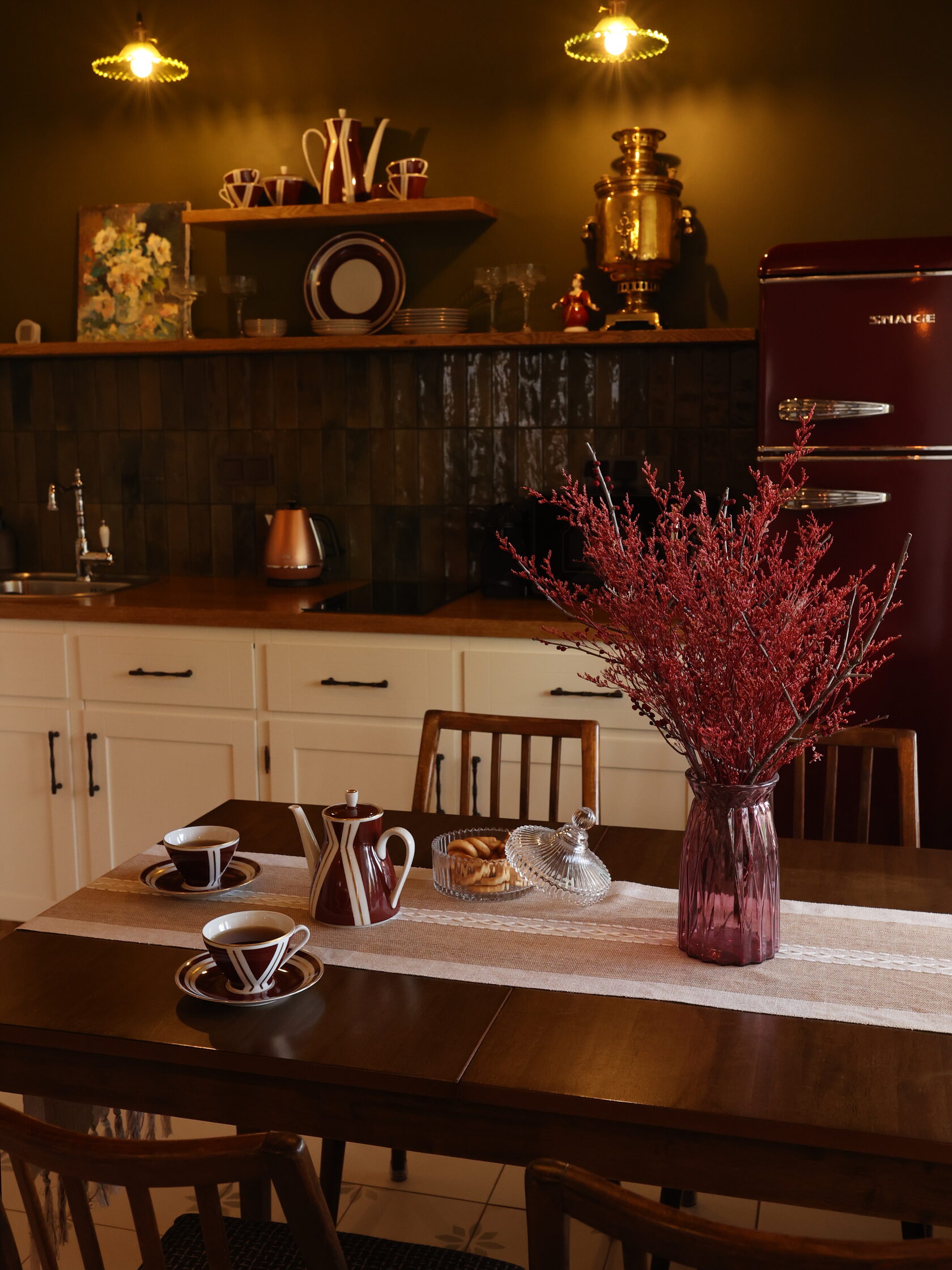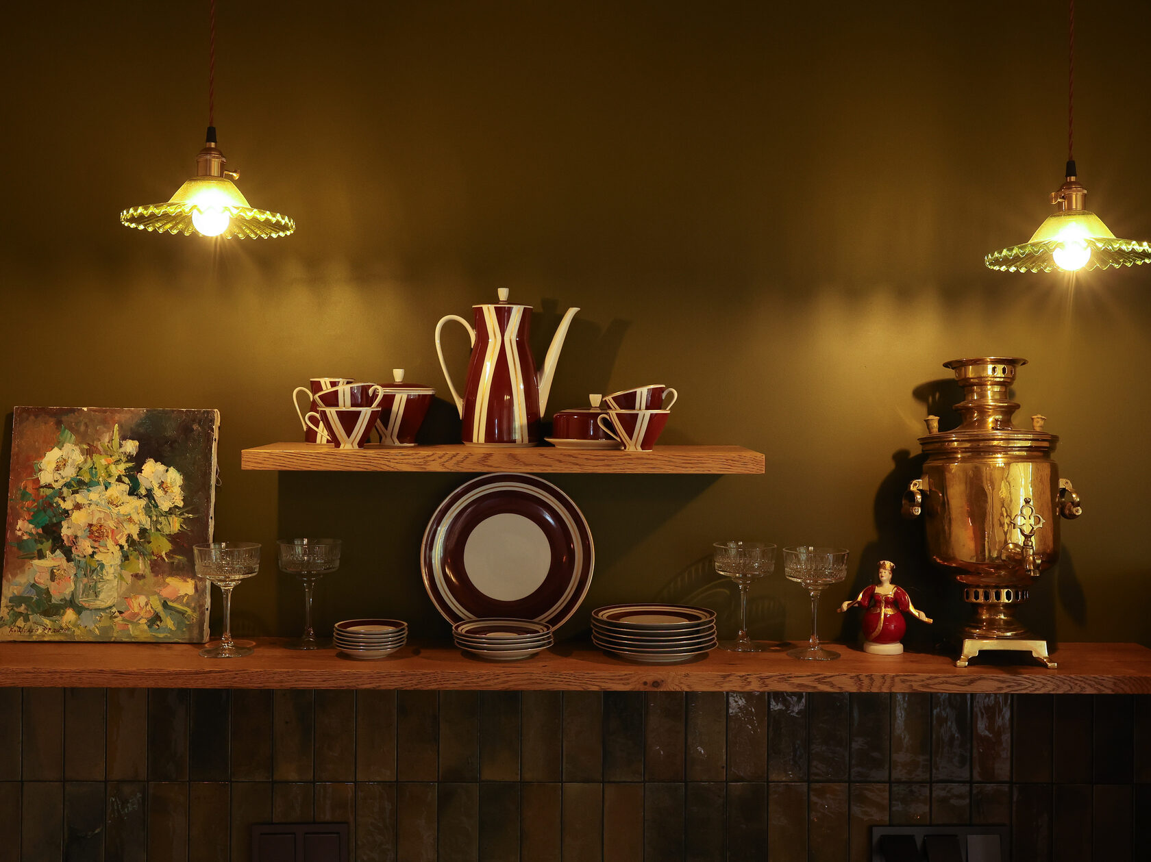 Особый уют создают предметы интерьера 60-х: люстры, сервиз и кресло из ГДР, стулья, кофейный столик и комод из Чехословакии, а настенные часы такие же как в фильме «Приключения Шурика».