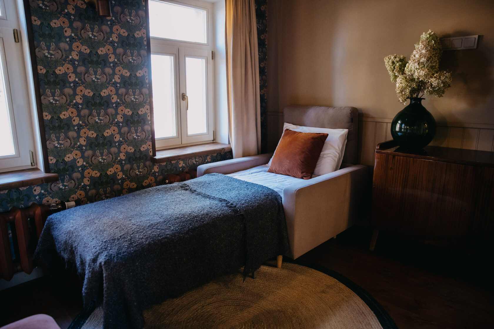 Уютная спальня с обоями, которые напоминают самобытные изразцы. Здесь две раздельные кровати, зеркало и место для хранения одежды.