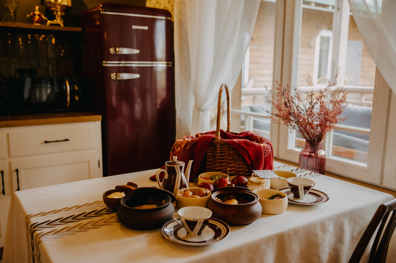 Приготовили для вас всю необходимую посуду, фужеры, сервис из ГДР. Здесь есть большой холодильник, микроволновая печь, индукционная плита и посудомоечная машина.
