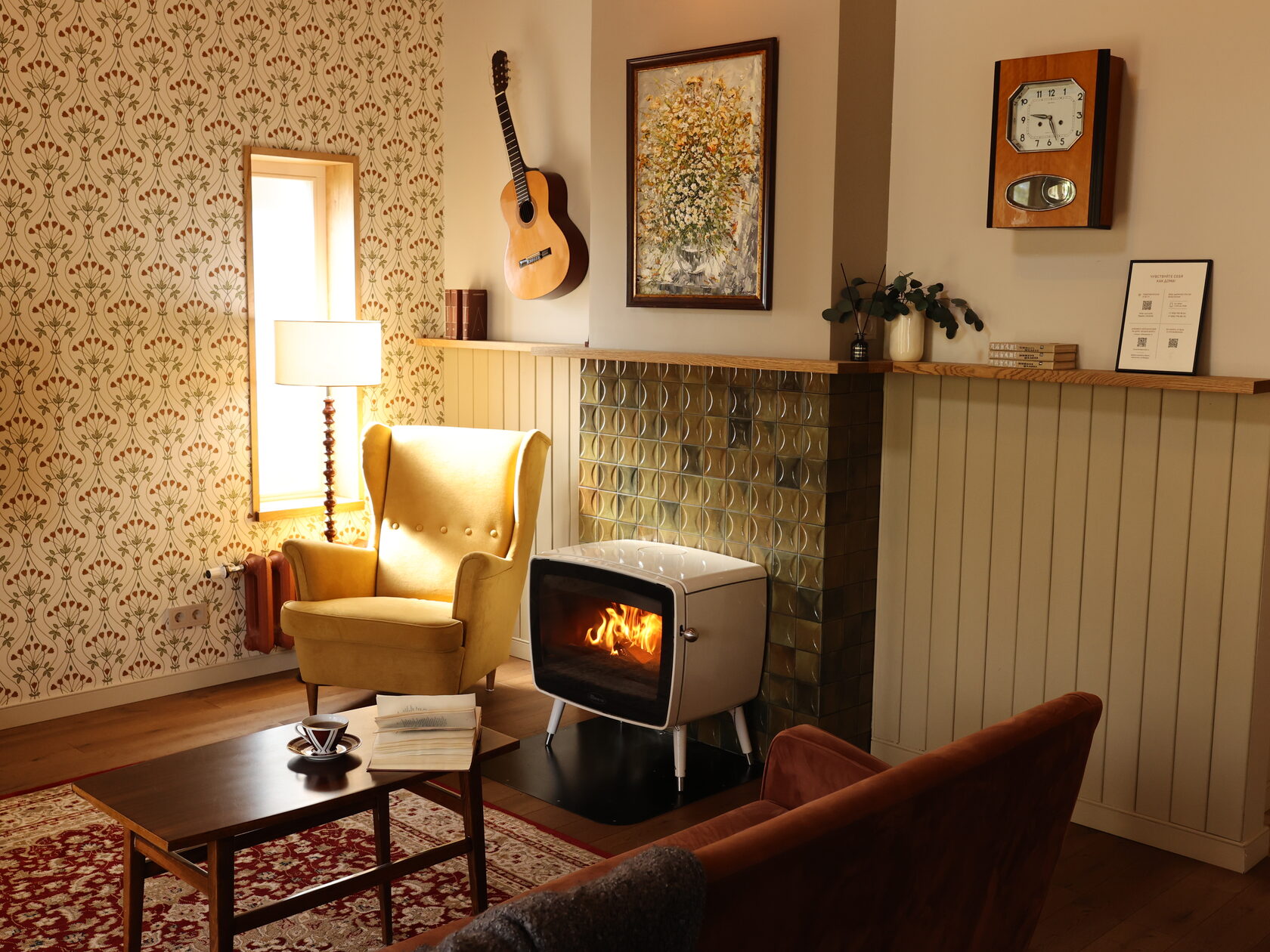 Здесь есть все, чтобы провести время в кругу друзей и семьи. Большой стол, печь-камин, диван, Smart-TV с Яндекс Алисой.